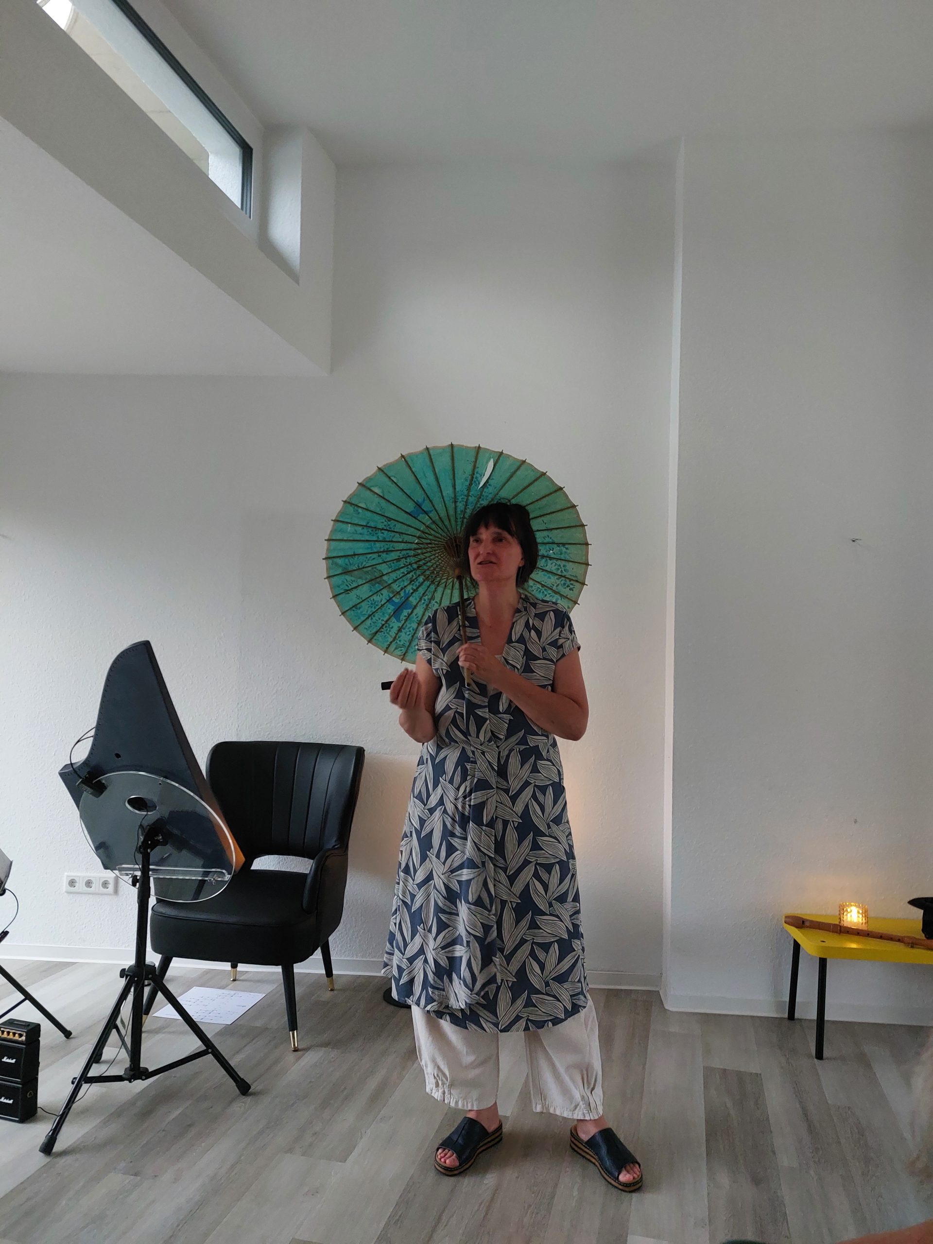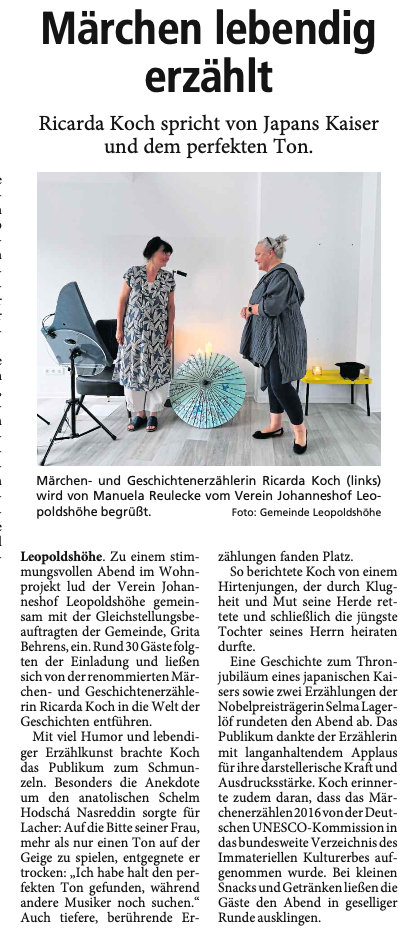 Die renommierte Märchen- und Geschichtenerzählerin Ricarda Koch unterhielt die rund 30 Zuhörerinnen und Zuhörer mit humorvollen Geschichten aus dem Leben, darunter die Anekdote von Hodschá Nasreddin, der von seiner Frau gebeten wird, nicht nur einen einzigen Ton auf der Geige zu spielen, weil auch andere Musiker mehrere Töne beherrschen. „Ich habe halt den perfekten Ton gefunden, während andere Musiker noch suchen müssen“, entgegnete der anatolische Schelm und Volksheld. Es folgte die Geschichte von dem Hütejungen, der die Herde vor Schaden bewahrt und als Dank die jüngste Tochter seines Herrn heiraten durfte. Anschließend gab es eine Geschichte zum Thronjubiläum eines japanischen Kaisers sowie zwei Erzählungen der Nobelpreisträgerin Selma Lagerlöf.