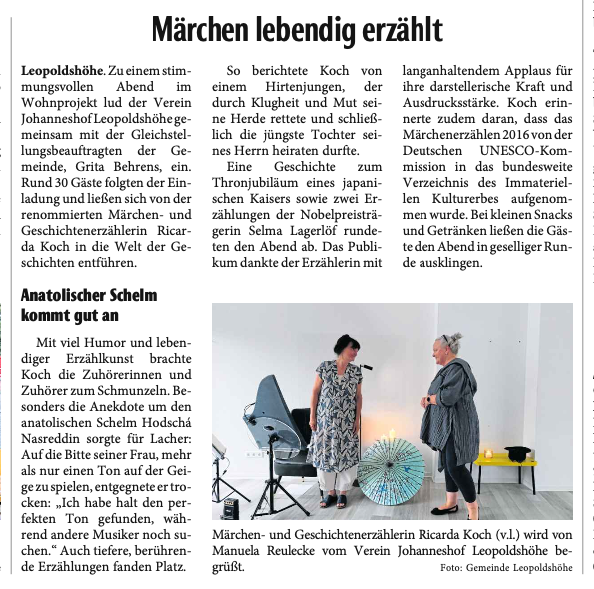 Ricarda Koch erntete großen Applaus für ihre darstellerische Kraft. Sie erinnerte daran, dass das Märchenerzählen 2016 von der Deutschen UNESCO-Kommission in das bundesweite Verzeichnis des Immateriellen Kulturerbes aufgenommen wurde. Bei Snacks und Getränken klang der Abend aus.