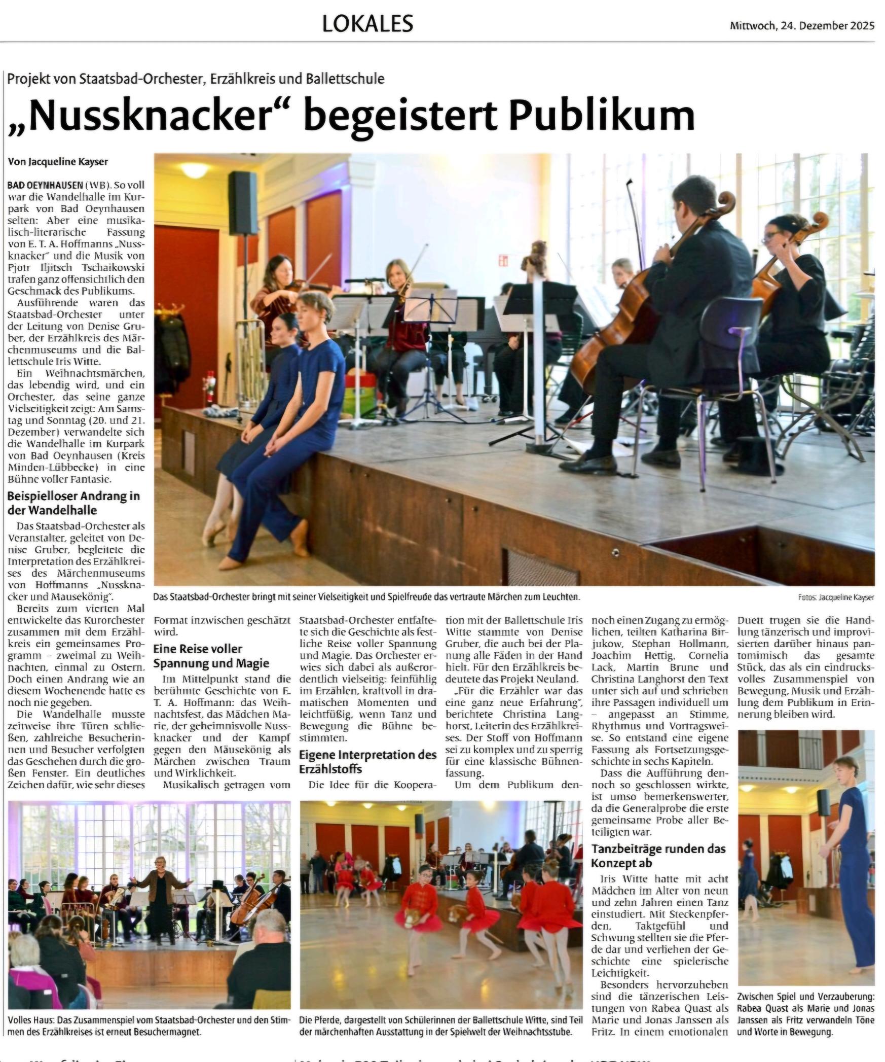 In der Reihe Erzählkonzerte mit dem Staatsbadorchester Bad Oeynhausen gab es in diesem Jahr die berühmte Geschichte „Der Nusskacker“ von E.T.A. Hoffmann erzählerisch, tänzerisch und musikalisch zu erleben.Bei beiden Veranstaltungen mussten an die 50 Besucher fortgeschickt werden, da die Wandelhalle aus allen Nähten zu platzen drohte. Langanhaltender und begeisterter Beifall belohnte am Ende die Darbietungen aufs Beste.
